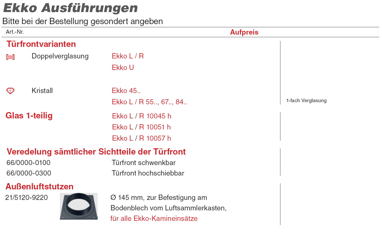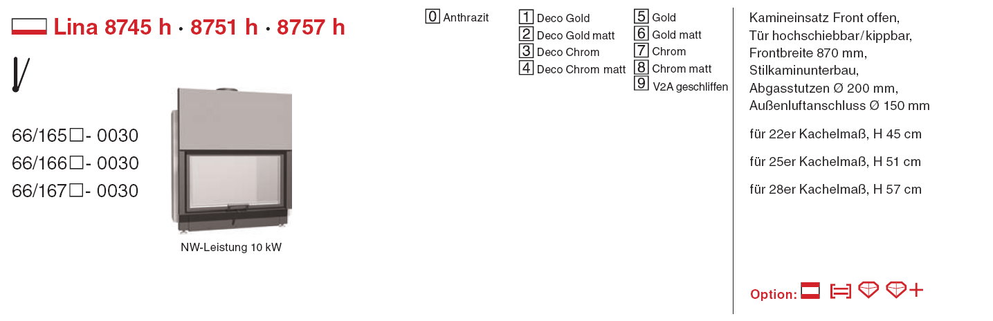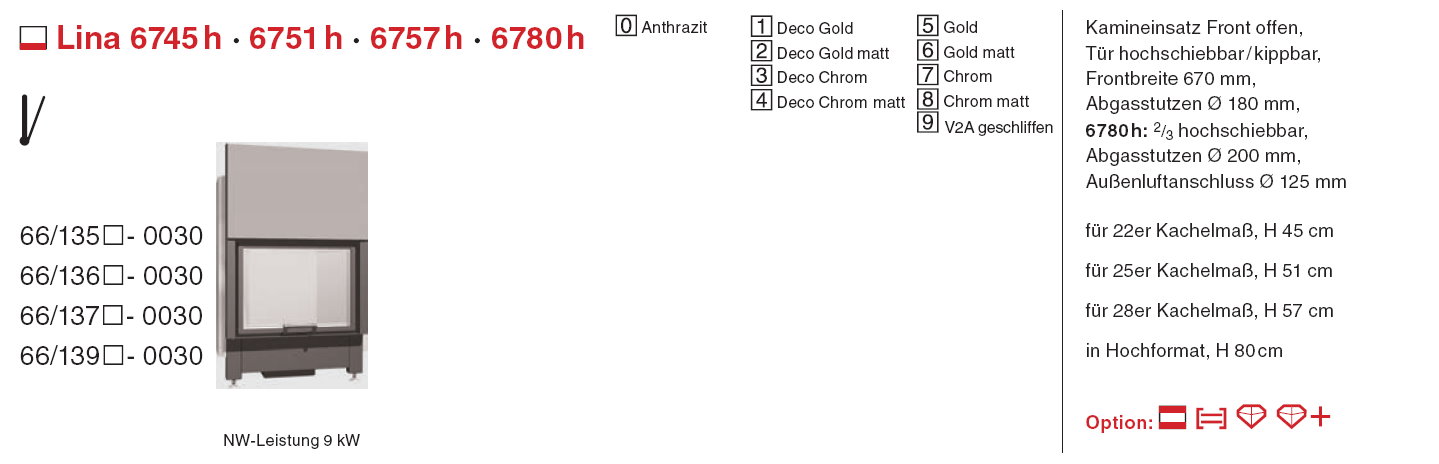 Die Abgasstutzen sind je nach Einsatz Ø 180mm oder 200 mm. Nachheizkasten Eingang Ø 180mm Ausgang Ø160mm. Alle Kamineinsätze BA 1 (Tür selbstschließend), wenn die Tür nicht selbstschließend sein soll bei Bestellung angeben!