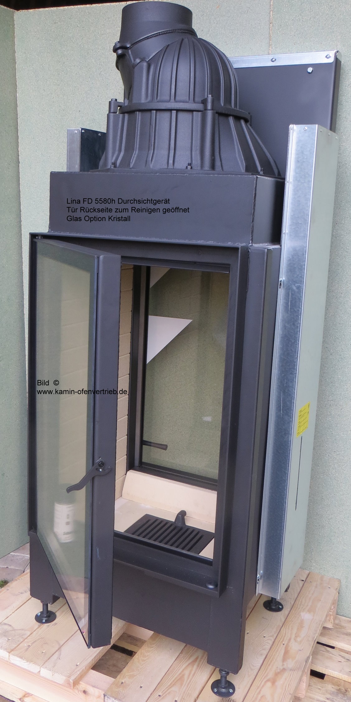 Als Option ist eine Außenbefeuerung möglich, in diesem Fall können Sie z.B. von einem Flur oder Nachbarraum heizen. Diese zusätzliche Feuerungstür kann seitlich oder hinten gewählt werden. Es gehört dann ein 40x40cm großer und 17,5-30cm einstellbarer, tiefer Mauerhals dazu.
